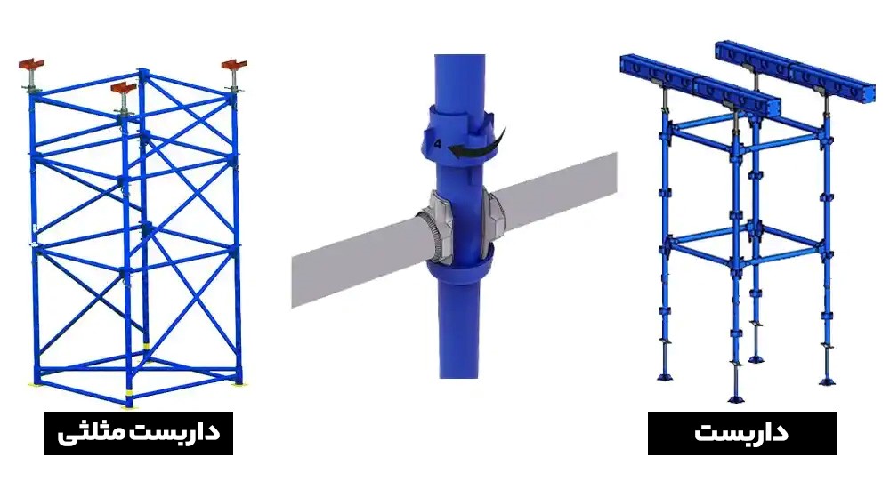 | نام دیگر | داربست فلزی، لوله ای. | داربست مثلثی یا داربست امگا. |